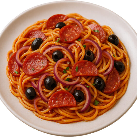 Scharfe Salami, Rote Zwiebeln, Oliven, Knoblauchöl, Tomatensauce